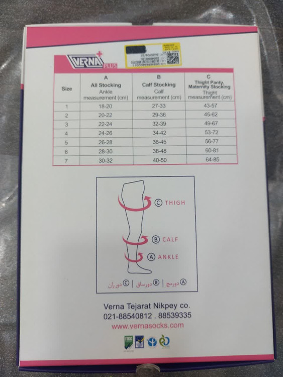 جوراب واریس باکفه بالای زانو جنس پارچه ترک با کیفیت مارک ورنا مدل ورنا پلاس سایز شماره 6 میباشد