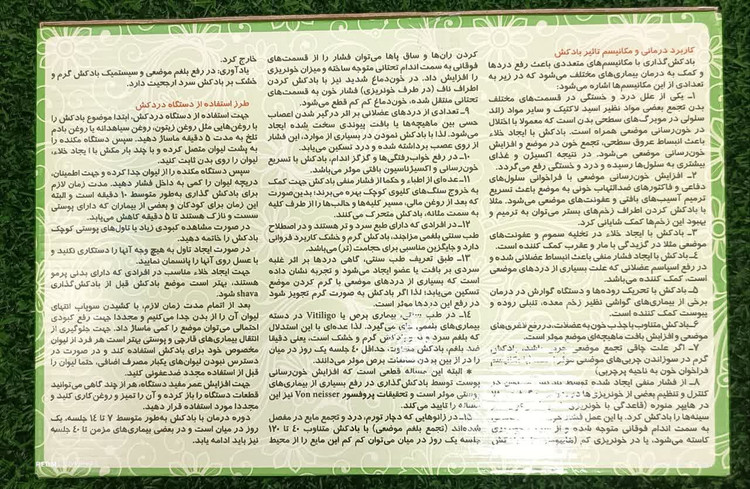 این بادکش دارای 20 سری مجزا برای استفاده در اندامهای مختلف است پشت ، کمر ، حتی برای صورت نیز میتوان از سریهای مختلف این بادکش استفاده کرد.